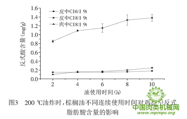以棕榈油进行油炸加工时,油炸鸡腿中所含主要反式脂肪酸为C18∶19t,这主要是由于棕榈油中的不饱和脂肪酸种类相对较少,主要是油酸。鸡皮中反式脂肪酸含量远高于鸡肉中,200℃下棕榈油使用2h时,鸡腿表皮中的总反式脂肪酸是肉中的9.7倍;在鸡肉表面色泽和油炸油使用时间相同条件下,温度越高,油炸鸡腿中反式脂肪酸含量越高。对于棕榈油,在160、180、200 ℃下油炸10h后酸价均远低于国家标准,而羰基值随使用时间和油炸温度的增加而升高,160℃下油炸10h已达到54.66 meq/kg,已明显超过国标关于煎炸油所允许的最高含量,180、200℃下使用8h后羰基值接近或已经超标。可以用来判定煎炸油的败坏程度。油炸温度越高,棕榈油使用时间越长,棕榈油品质变得越差,而且加工的鸡腿所含的反式脂肪酸含量越高。因此,以棕榈油进行油炸加工产品时,应选择160℃左右的加工温度,并控制棕榈油使用时间不超过10 h。