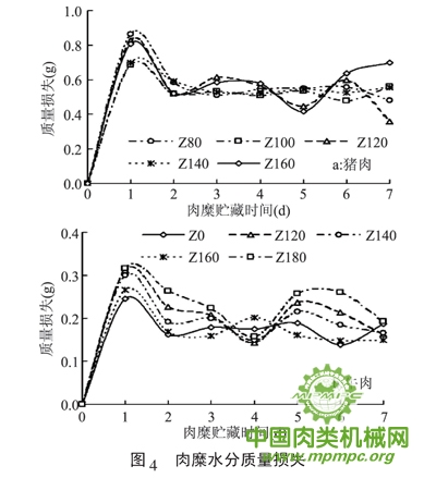 对于牛肉肉糜,如图4b所示,在贮藏第1d后,肉糜水分损失最大,最大质量损失为0.863g,最大损失率约为4.29%。贮藏2d后,肉糜的水分质量损失稳定在0.32g 左右,损失率约为1.53%。此时,Z160样品的水分损失情况变化最为平稳,贮藏2d后的水分质量损失最大值为0.202g,最小值为0.148g,相应的损失率数值分别为1.01%和0.748%。