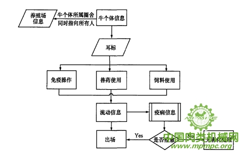 养殖过程管理肉牛在养殖阶段所要记录的数据包括饲料投放信息、兽药使用信息、免疫信息、流动信息等。饲料投放信息包括牛个体编码、饲料投放日期、伺料名词、投放数量、添加剂名称、休药期、操作人等;兽药使用信息:记录重大疾病的发生和用药的品种、用量和停药时间等。包括牛个体编码、用药日期、兽药名称、用药原因、施药方式、剂量、休药期、兽医姓名等;免疫信息包括牛个体编码、免疫日期、免疫类型、疫苗名称、疫苗来源、兽医姓名等;流动信息记录了牛转入、转出、死亡和淘汰的信息。具体包括牛个体编号、发病名称、发病日期、诊治经过、主要使用药物情况、治疗结果、无害化处理过程、责任兽医、备注。具体流程如图3所示: