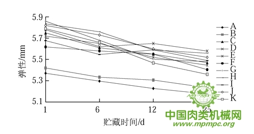 图 2 贮藏期间番茄粉部分替代亚硝酸盐对灌肠弹性的影响