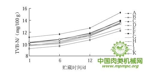2.5 番茄粉部分替代亚硝酸盐对花生蛋白灌肠TVB-N值的影响