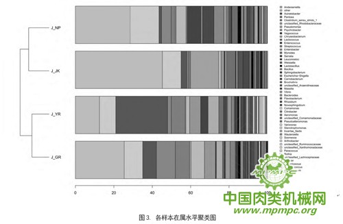 维恩图可在OTU水平对4种肉类调理食品中菌群进行分析,图2直观的反映了样本间的共有OTU和特有OTU。为了清楚显示,本实验将2 个平行样本合并分析(J-JK1、J-JK2合并为J-JK,其他样本类同),J-JK、J-YR、J-GR、J-NP 获得的OTU数分别为3486、5014、5122和3773,所有样本共含有12000余种不同的OTU。由图可知,每2种实验样本之间相同的OTU数在1019-1902之间,4 种样本之间相同的OTU数为502个,占总OTU数的4.16%。