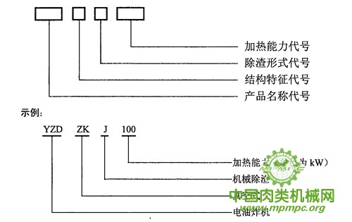 油炸机除渣形式代号按除渣形式分为机械除渣(J),水力除渣(S),混合式除渣(H)人工除渣(R)。