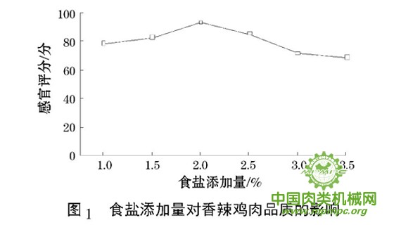 2.3.1 食盐添加量对香辣鸡肉品质的影响 以100g原料为标准,分别添加1.0%、1.5%、2.0%、2.5%、3.0%、3.5%食盐制备香辣鸡肉,以香辣鸡肉的感官评定为标准,确定食盐的添加量对香辣鸡肉的组织结构、弹性、色泽、口感、风味的影响。
