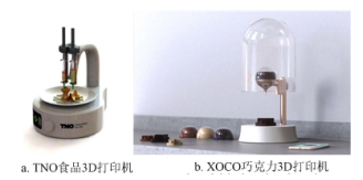 极坐标的食品3D打印机由底盘、挤出喷头和支杆组成。底盘可实现旋转运动,挤出喷头可实现上下移动和绕支杆的旋转运动。目前市场上的极坐标食品3D打印机有荷兰的TNO食品3D打印机(图5a)和XOCO巧克力3D打印机(图5b)。