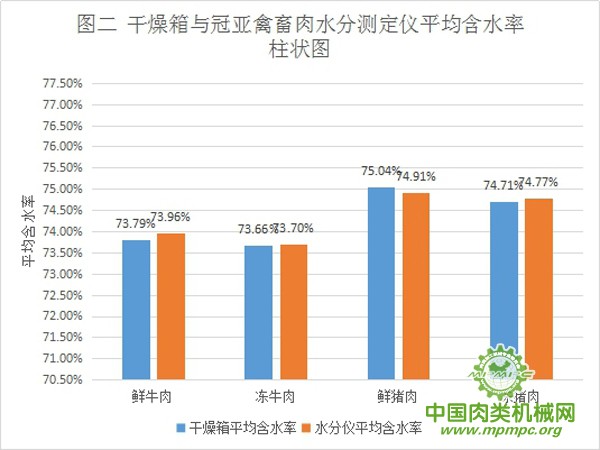 干燥箱与冠亚禽畜肉水分测定仪平均含水率柱状图如图二,干燥箱与冠亚禽畜肉水分测定仪平均测试时间柱状图如图三。
