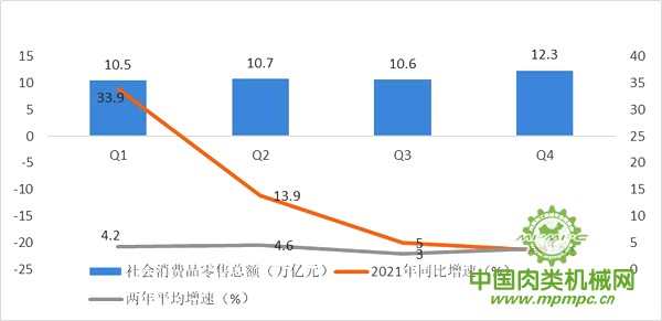 2021年,社会消费品零售总额实现44.1万亿元,同比名义增长12.5%,比2019年增长8%,近两年平均增长3.9%。扣除价格因素,2021年社会消费品零售总额实际增长10.7%。