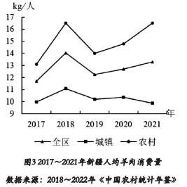 2022年,新疆受新冠疫情扰动、叠加经济下行双重影响,餐饮关闭、外出活动受限,城市居民在外羊肉消费减少,中低收入群体羊肉购买力和购买意愿下降,全区羊肉消费量略有下降。《2022年中国农村统计年鉴》数据显示,2021年新疆全区平均羊肉消费量为13.3 kg/人,同比增长0.6 kg/人,增幅为4.7%;分城镇和农村来看,2021年农村羊肉消费量为16.5 kg/人,城镇羊肉消费量为9.9 kg/人,农村比城镇高6.6 kg/人。从近5年年人均羊肉消费量来看,全区、农村、城镇羊肉消费量保持在12.80kg/人、14.98 kg/人、10.31 kg/人左右,其中农村地区羊肉消费量增长明显,2021年较2017年羊肉消费量增长1.61 kg/人,增幅达26%(图3)。