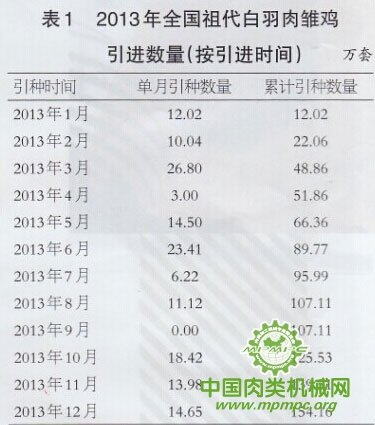 2013年,我国有15家企业从国外引进了祖代白羽肉雏鸡(见图1)。从地域分布来看,以北方为主,分布是:北京3家,吉林、山东、辽宁各2家,河北、福建、河南、黑龙江、江苏、安徽各1家。