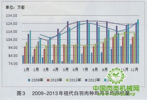 2013年,在产祖代种鸡平均存拦量为117.51万套,同比略有减少,是2009军以来首次出现下降(见图3)。2013年,受H7N9流感影响,父母代雏鸡销售极度困难,祖代场提前淘汰种鸡的现象较为普遍。但这并不会影响到种源的充足供应。受H7N9流感影响,2013年4~10月的在产祖代存栏低于2012年同期。2013年,在产诅代存栏月度波幅较大。尤其是当处于下行区间时,2013年祖代种鸡存栏的下降幅度要明显大于2012年。