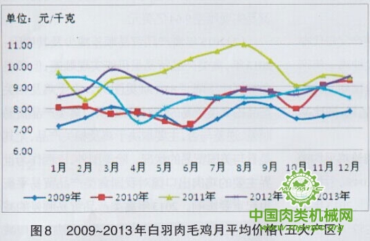 2013年,白羽肉鸡养殖行情整体较差,年平均价格为8.60元/千克,比本就行情不佳的2012年又下降了3.82%(见图8)。从月度数据环比来看,全年价格走势受H7N9流感,季节性因素,以及民众消费意愿较差的综合影响。