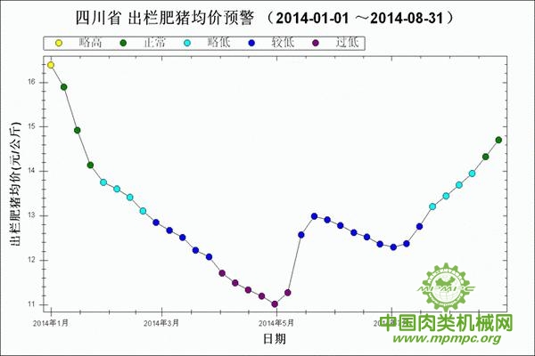 据四川生猪监测预警系统对18市68县监测,2014年8月,四川生猪价格逐周上涨,育肥猪月均价已上破14元/公斤;饲料价格高位运行,小幅波动;猪粮比和猪料比持续回暖,到月末效益已过成本线。