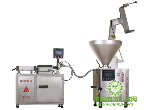 ⑷、本机可选配自动扭结装置、标准车提升机。自动扭结装置适用于天然肠衣、蛋白肠衣、烟熏肠衣等产品,扭结速度根据产品和原料的不同可无级调整。