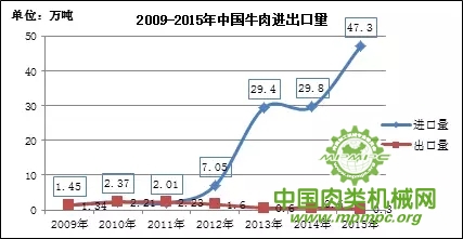 据统计,2015年,我国进口牛肉总计47.3万吨,同比增长58.7%。进口国主要是澳大利亚、乌拉圭、新西兰、巴西、阿根廷、加拿大、哥斯达黎加、智利、匈牙利等国家。进口种牛来源为澳大利亚,新西兰,乌拉圭。进口牛精液则来自于美国、加拿大、法国、瑞典、德国、罗马尼亚、荷兰、新西兰、澳大利亚等国家。