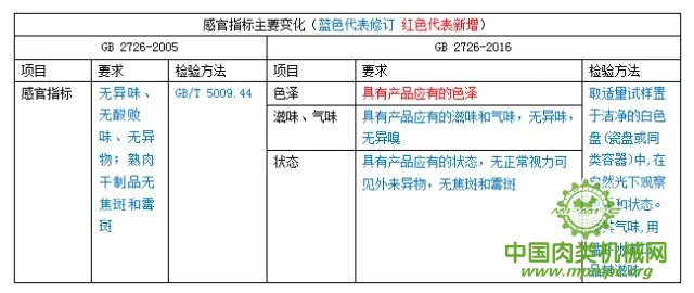 (2)与GB 2726-2005(含1号修改单)相比,取消了水分指标要求(水分不是一个与熟肉干制品食用安全直接相关的指标,仅仅与熟肉干制品的品质有关,因此本次修订中予以删除。)