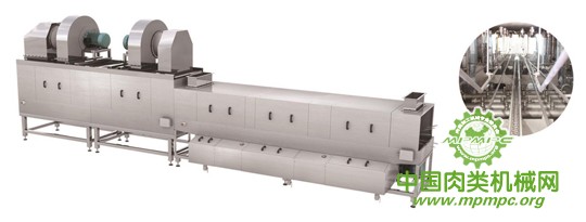 全自动清洗烘干机主要分为三段清洗,第一段为42℃的温水清洗,通过1台卫生级的循环水泵输达到立体调协的喷淋管,通过可调、可拆式的喷淋头对箱体进行立体的冲刷消毒清洗。清洗水一部分排到污水管网,大部分经过滤后流水循环水箱循环使用。第二段为82℃的热水清洗,通过1台卫生级的循环水泵输送到立体调协的喷淋管,通过可调可拆式的喷淋头对箱体进行立体的冲刷消毒清洗。清洗水经过滤后流入循环水箱循环使用。第三段为清水漂洗,通过一次性的清水对箱体四周以及内部进行喷淋清洗,喷淋后的水流入第一段循环水箱重复利用。清洗完成后的箱体则通过另一条输送线链条进入风干机进行风干处理。清洗消毒干净的周转箱通过净箱输送总线自动输送至净箱输送线。