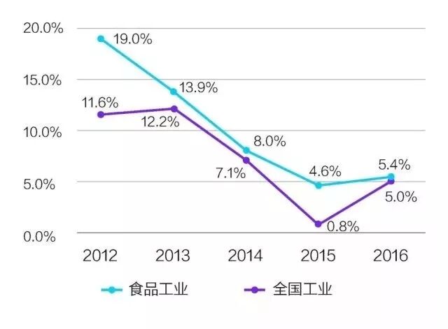 近年来,食品工业总量规模持续壮大,产业支柱地位稳固。《报告》显示,2017年上半年,食品工业增加值同比增长6.7%,若不计烟草制品业,同比增长则达到8.3%,比全部工业高1.4个百分点。从经济效益来看,食品工业整体保持平稳增长,盈利能力稳定趋好。规模以上食品企业2012年~2016年主营收入增长速度均高于全国工业平均水平(见下图);2017年上半年,主营收入和利润总额分别达到59499.2亿元和4092.4亿元,同比分别增长8.7%和6.9%。