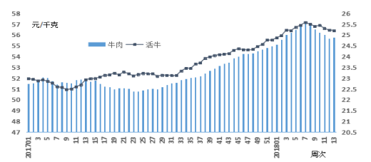 (二)牛肉价格高位上涨。17年下半年开始牛肉价格一路上扬,年底攀至55元/千克,18年春节期间突破57元/千克,3月底回落到55.8元/千克,同比上涨7.4%。17年春节后,活牛价格旋即走出上涨行情,由22.5元/千克涨至年底24.8元,18年春节前一周达到25.6元/千克,3月底暂时降至25.2元/千克。同比上涨9.9%。牛源紧张,犊牛、架子牛价格居高不下,3月底,市场改良公犊30~34元/千克,架子牛约26.6元/千克。
