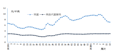 (四)市场分析。蛋价下跌主要因为:一是产量增长。去年下半年蛋价上涨,补栏增加,蛋鸡产能逐步上升,蛋产量稳步增长;二是春节备货不及预期。去年亏损,今年春季前蛋商备货相对谨慎,恶劣天气影响,销区备货推迟,产区形成一定积压;三是蛋鸡养殖东扩南下,北蛋南运总体减弱;四是节后鸡蛋消费以消耗存货为主,猪价大跌,对鸡蛋的替代作用增强。