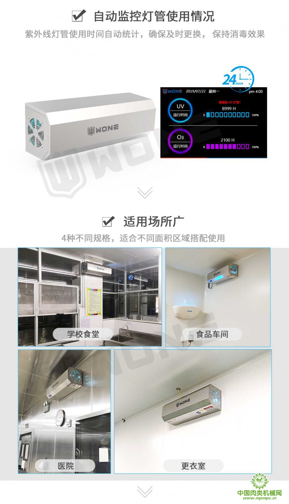 真正能人机共存的全天候消毒机。白天辐照强度高达20000uw以上的紫外线消毒,晚上高浓度臭氧无死角灭菌。多功能控制器实现分组定时、监测环境温度、湿度等空气质量数据。快拆的墙面安装机构,实现夹层板和实体墙均能快速单人安装的高效率。利用WONE联合食安i-clean系统能实现远程监控。可以对小空间和内包装材料消毒,亦可对瓜果蔬菜鲜花等实现保鲜作用。