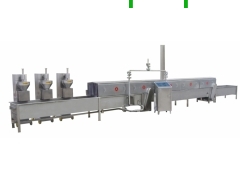 肉丸成型蒸煮冷却流水线由三大部分组成,即成型与蒸煮部分、冷却部分、传动系统部分。成型槽与蒸煮槽的水经两槽内蒸汽管道加热,水温用高温高压阀通过调节蒸流器控制,达到成型槽的水温约75度,蒸煮槽水温为90度左右。成型槽内的水通过热水循环泵形成水流,使从肉丸机出来的肉丸入水后便开始向成型槽末端流动,这一流动过程通过调节阀控制水的流速达到控制肉丸流动速度的目的,即按工艺使肉丸达到理想的成型状态。