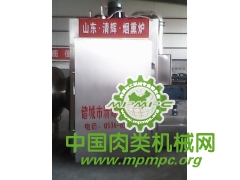 3、 发烟系统:上部为锯沫箱,由减速机带动搅拌机构,锯沫周期地送与下部发烟炉盘的电热器,由电控箱上的点火按钮控制,锯沫受热缓慢燃烧而发烟,被风机吸入主机以熏制熟食品。